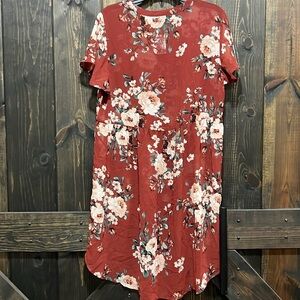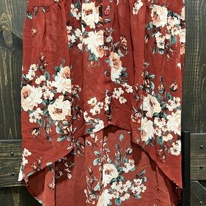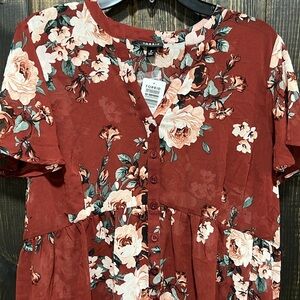 New with tags. Torrid brand Lexie Tunic. Babydoll style. Chiffon. Size 0 equivalent to 12 or Large. Official color is Brown Floral. Looks burgundy. Beautiful all over floral print. Button front. Short sleeves. Hi low hem. Semi-sheer. Lightweight material.