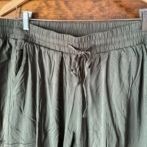 New with Tags; Joggers; Olive; Size 2 (18-20); Cargo Pockets; Hidden Elastic Waist w/Self-Tie; Slip-Pockets: Hidden Elastic Cuffs; 97% Rayon & 3% Spandex; Machine Wash & Line Dry; Waist 18"; Rise 13"; Inseam 26"; Leg Opening 5"