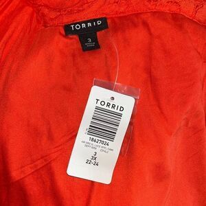 This beautiful top is made by Torrid. It’s a fun orange color, ruffle and lace detailing and faux buttons down the front. Torrid size 3 and NWT. Smoke and pet free home.