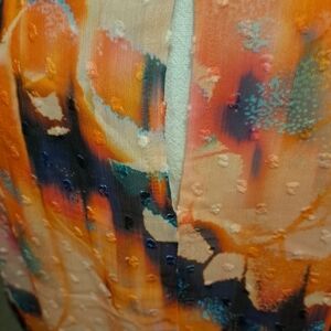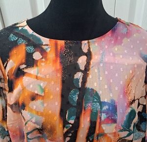 multi colored abstract print with a scoop neckline, clip dot, blouson sleeves, smocked cuffs, keyhole back, shell & lining 100% polyester, pit to pit 23.5" sleeve 23.5" length 27"
