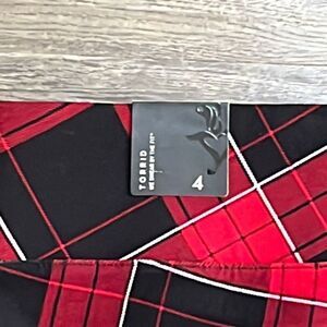 These pants are made by Torrid. They are a red and black plaid ponte pull on style. Torrid size 4 (see size chart) and NWT. Smoke and pet free home.