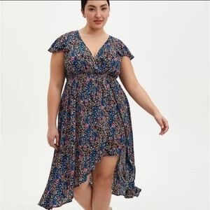NWT Torrid Sixe 2X [18-20] Floral Crinkle Gauze midi walk through Romper Dress, cap sleeve, 100% rayon, V neck, elastic Waist, back tie detail, asymmetrical hem, Lined top