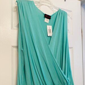 This is a new-with-tags seafoam green Torrid tunic tank in a soft, drapey, stretchy blend of 50 percent polyester and 50 percent rayon. Low v-neck and handkerchief hem. Size 3. Smoke-free home.