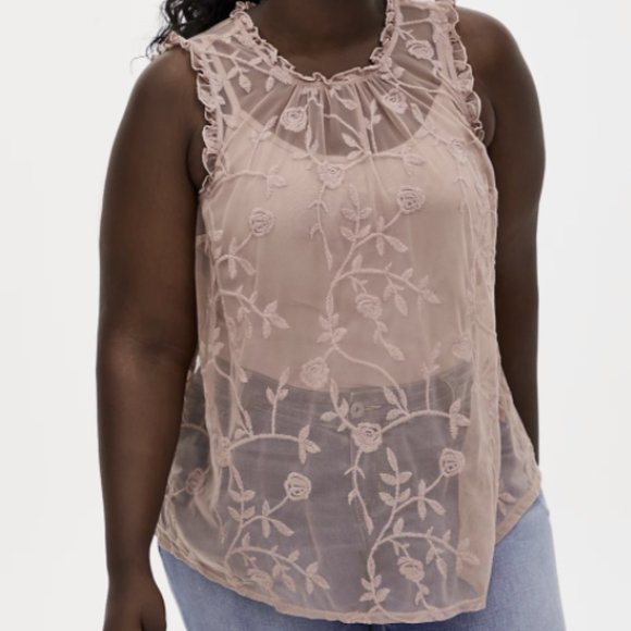 NWT Torrid Taupe Sheer Mesh Embroidered Blouse