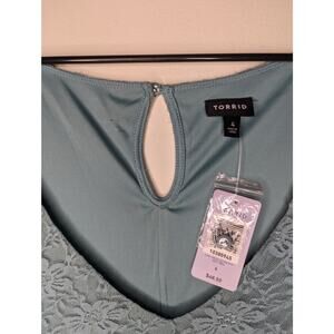NWT Torrid Turquoise Floral Lace Short Sleeve V-neck Skater Dress. Buttoned keyhole opening in back, comes with extra button. Under the pit area there's some elastic fiber poking out.