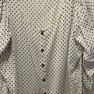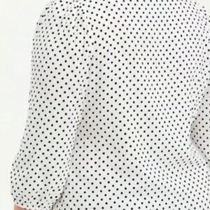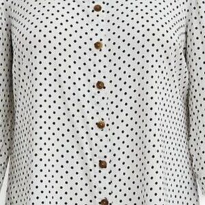 Chic white blouse with black polka dots. Features button-down front. Perfect for casual or office wear.