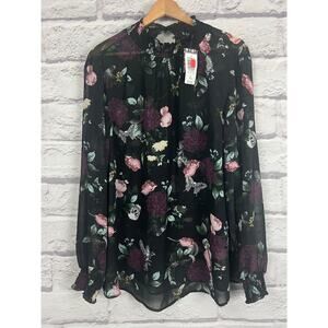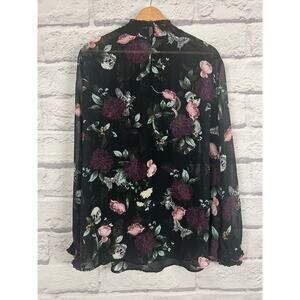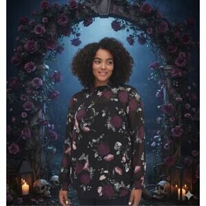 Embrace a darkly romantic aesthetic with this stunning Torrid blouse. The sheer chiffon fabric features an intricate print of florals, skulls, snakes, and butterflies for an edgy yet whimsical look. It's designed with a sophisticated smocked mock neck and matching cuffs, perfect for a statement-making outfit.