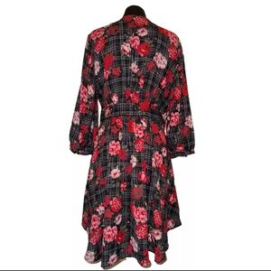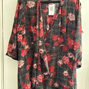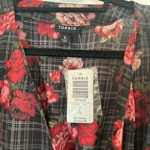 NWT Torrid Black Rose Plaid Wrap Blouse with hi-lo hem, V-neck, 3/4 sleeve with button cuffs. *No stretch* in material. 100% polyester. Wraps tie front and has internal hidden button closure. Size: 0. Size: L (12). Condition: New With Tags. Smoke-free pet friendly home. Questions? I will respond ASAP. Make me an offer!