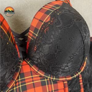 Torrid XO Boost Plunge Push-Up Bra, women's size 44D, red and black plaid with black lace. Underwire support, adjustable straps, plunge neckline. Bold Plaid aesthetic: striking tartan pattern, delicate lace overlay, enhancing plunge silhouette. Think confident style, ultimate lift, and a touch of edgy femininity. This bra provides both support and a captivating look.