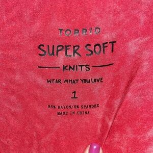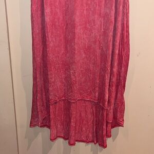 Gorgeous jersey knit stretchy fabric. Color is a red / coral with variegated coloring. As intended by manufacturer. Never worn, tags still attached. Higher hem line in front