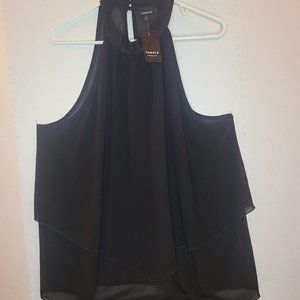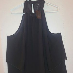 An elegant mock neck blouse. While the front is covered-up, the cut-away tulip back reveals a flash of skin. Two button neck closure.