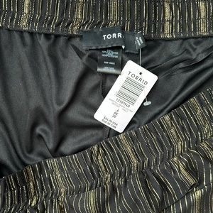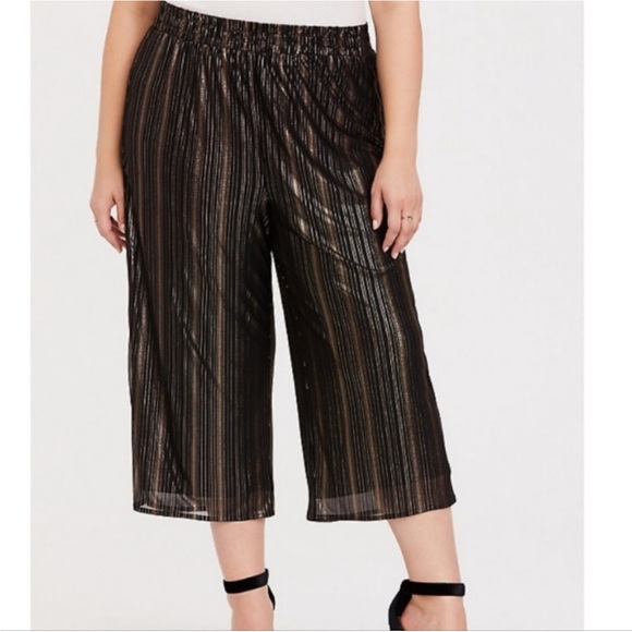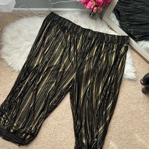 NWT Torrid shine black and gold metallic pull on wide leg crop capri pants. The perfect pants for your holiday or New Year’s party! Stretchy with elastic waist. Size 6x plus size.