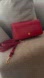 Chic cherry red leather bag with gold emblem. Comes with adjustable strap.