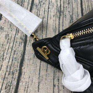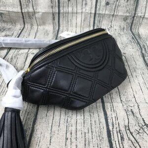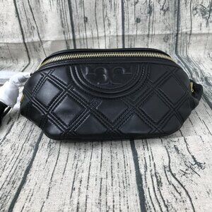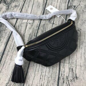 "The Fleming Small Belt Bag is made of smooth leather with diamond quilting and an embossed bombé logo.