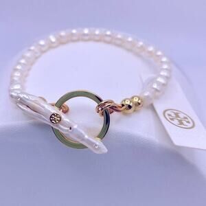 NWT Tory Burch Gold Logo Fresh Water Pearl Toggle Bracelet