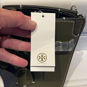 Elegant dark green crossbody bag by Tory Burch. Accented with a navy strap and silver hardware.