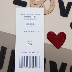 NWT Tory Burch Love Is Universal Frame Mini Crossbody Brand New with attached tags, 100% Guaranteed Authentic!! Tory Burch Dust bag and gift bag Included! MFSRP: $598.00 +tax Color: New Cream Make a statement that also sends a message of peace and love. The Love is Universal Frame Mini Crossbody, in appliquéd leather, is designed with a unique sunburst closure and an adjustable crossbody strap Leather Sunburst snap closure 2 interior card pockets Adjustable leather crossbody strap with 23.3" (58.5 cm) drop Height: 4.8" (12 cm); length: 8" (20 cm); depth: 1.7" (4.2 cm)