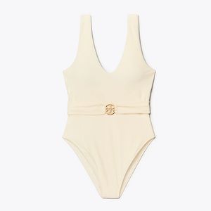 NWT Tory Burch Miller Plunge One-Piece Swimsuit Ivory in Size L