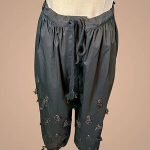 Our drawstring pant, crafted from crisp cotton poplin, has a relaxed silhouette that tapers to an adjustable ankle. Raffia tassels are applied by hand through an intricate embroidery technique. Comfortable and chic, it is a versatile piece to wear in different ways. Play with proportion and texture when you pair it with a tweed peplum top and belt, as shown in our lookbook.