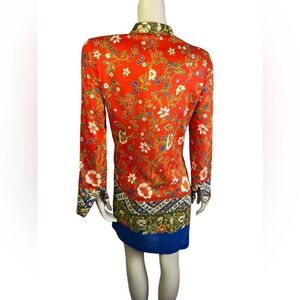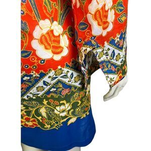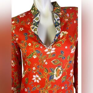 This NWT lovely colorful easy tunic from Tory Burch is a home run! Called the Stephanie dress, it’s a long sleeved, lightweight, loose-fitting, and works as a cover-up at the pool or a dress for dinner! Called Samba Batik Flower, the fabric is orange with floral print in white, green, blue, and yellow, with the bottom of the dress banded in blue. This is a size 2, but I can wear it and I am a 6. Measurements are as follows: