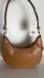 A logo-embossed exterior and gleaming hardware add visual intrigue to a crescent-shaped shoulder bag fitted with an adjustable strap for comfortable wear.