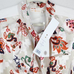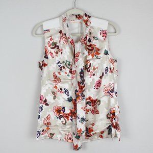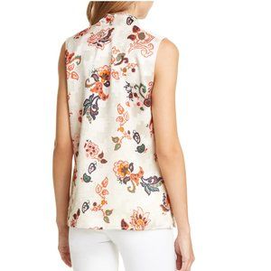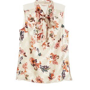 A vibrant pattern of paisley-inspired blooms refreshes this elegant tie-neck blouse cut from a luxurious burnout fabric.