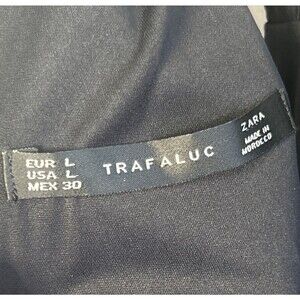 The NWT Trafaluc Bodycon Dress by ZARA in size Large is a stunning dark blue/black dress perfect for various occasions such as parties, weddings, or workwear. This elegant dress features a sleeveless design with a scoop neckline, zip closure, and a slit at the hem in the back. Made with stretch fabric, this knee-length dress exudes classy and sophisticated vibes, making it a versatile wardrobe staple for any season. Made in Morocco, this designer dress is a timeless addition to any woman's wardrobe.