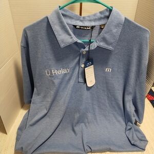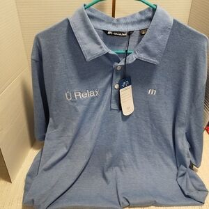 NWT Travis Mathew Size L, "U RELAX" script Comfortable and stylish blue polo shirt . Perfect for casual outings.