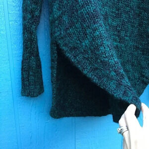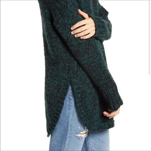 This Treasure and Bond sweater features a dark green color, knit style, turtleneck, long sleeves and a split hem on each side.