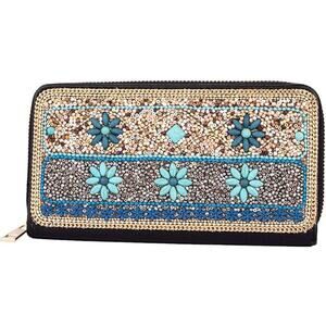 This Treeable Bohemian Beaded Wallet features a rich blue floral leather exterior adorned with handcrafted beads. The long zip-around design includes multiple card slots, full-length bill sleeves, and a secure closure—perfect for stylish everyday use or bohemian-inspired gifting.