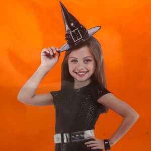 Sparkly black silver dotted dress with silver leggings and belt, topped off with pointed hat embellished with sparkly band and buckle.
