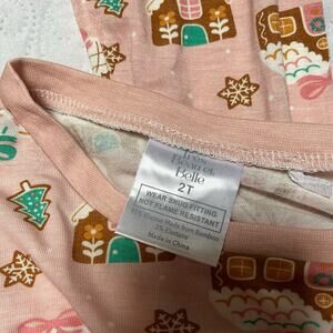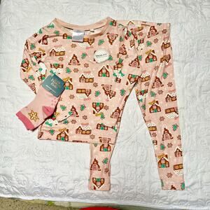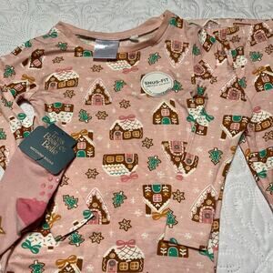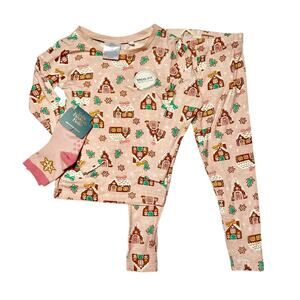 New with tags Beau et Belle 3 piece pajama set. Includes long sleeve and pants loungewear with grippy socks in bamboo. Pink gingerbread house Christmas design. Size 2T.