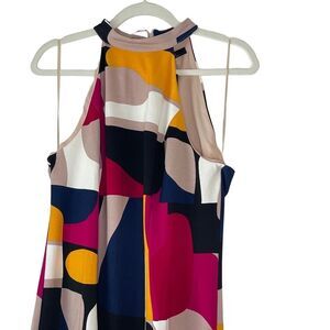 70's vibe with large geometric shapes and button collar. Lined with soft jersey knit and made from a thicker jersey for comfortable, flattering not body hugging fit. Halter Neck with button closure.