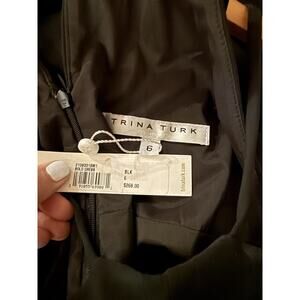 The NWT Trina Turk 'Bold' Sheath-Front Keyhole Halter-Neck Dress in Black, Size 6 is a stylish and elegant party or cocktail dress. Made from 92% polyester and 8% spandex, this sleeveless dress features a halter neckline with a keyhole detail and a front hook & eye closure. The dress is designed with pleated accents and falls to a short length, making it a perfect choice for special occasions. With its solid black color and sleek silhouette, this Trina Turk dress exudes sophistication and flair for those looking to make a statement at their next event.