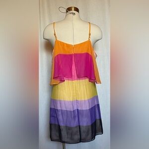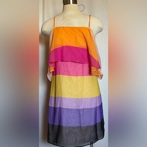 Bright fun stripes. Lined. Adjustable spaghetti straps. Flutter ruffle around neckline.