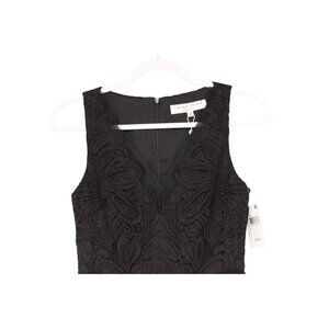 This NWT Trina Turk dress in size 2 is a stunning cocktail dress made of black silk with lace mesh detailing. It features a V-neckline, sleeveless design, and a knee-length hem. The dress is perfect for formal occasions like weddings, parties, or business events. It is lined and includes a zipper closure for easy wear. The Trina Turk brand is known for its designer pieces with a touch of elegance and sophistication.