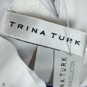 New with tags, Trina Turk one-piece swimsuit in a vibrant floral print, size 4. Features an open racerback design for a flattering silhouette and modern style. Perfect for vacation, resort wear, or lounging poolside in bold, colorful elegance. Fully lined for comfort and coverage.