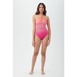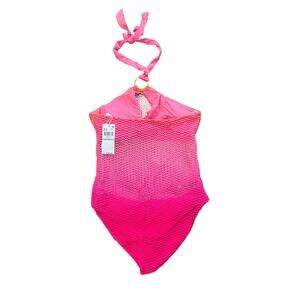 Intricate crochet blends with saturated pink-to-yellow ombre color to create sophisticated, vacation-ready style in this bright, one-piece swimsuit. A high halter neckline, adjustable sash ties, a front ring connector, and an open crochet overlay add a sexy touch to this one-piece bathing suit, perfect for your next tropical getaway.