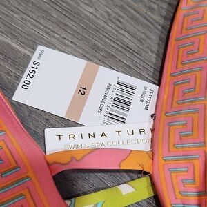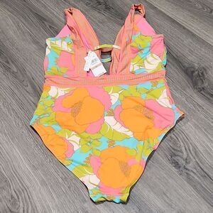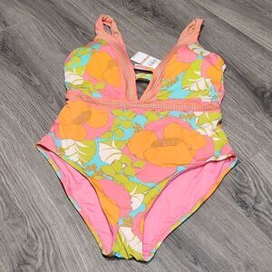 NWT Trina Turk Playa De Flor Plunge Mallot One Piece Swimsuit, beautirul quality, colors and pattern. No flaws at all. Pit to pit is 16" and 28" long.
