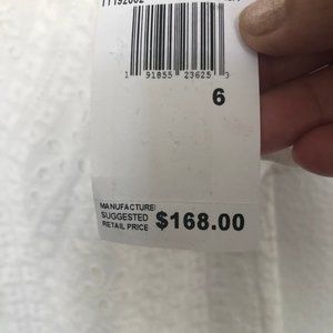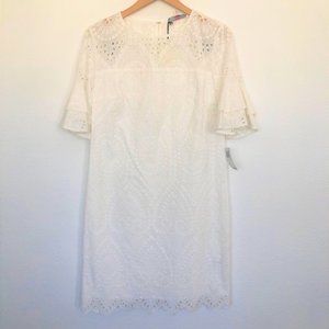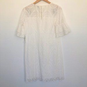 Eyelet short sleeve dress in Whitewash. Lined with sheer section at top.