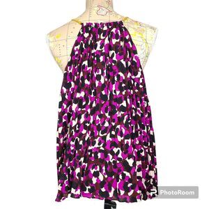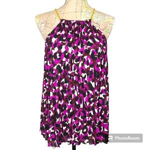 Elevate your style with this Trina Turk size Medium Nayarit purple, black, and white abstract print sleeveless top. Made from 100% polyester, this top offers a comfortable and lightweight feel. The gold-tone chain neckline adds a glamorous and stylish touch to the top, making it perfect for both casual and dressy occasions. The full accordian pleated detailing adds texture and visual interest to the design. This top is brand new with tags, ensuring its pristine condition.