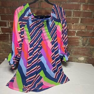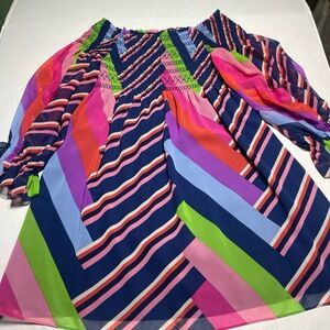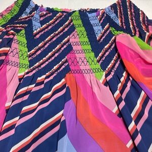 Turn heads in this stunning NWT Trina Turk multicolor smocked dress. Featuring vibrant stripes in bold hues of pink, blue, green, and purple, this chic dress is designed with a relaxed fit, smocked detailing, and flowy long sleeves. Perfect for resort wear, vacations, parties, or a statement everyday look. Lightweight and comfortable, it’s a versatile piece that brings both style and ease.