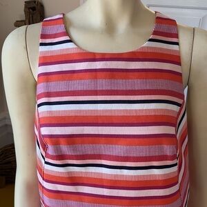 Pinks, orange, purple, navy, cream striped exterior, crew neckline, and back zip closure complete this flattering sheath dress.