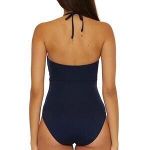 Monaco one piece swimsuit features a plunging neckline with gold plated ring details. Offers removable soft cups, removable halter ties, and moderate bottom coverage.