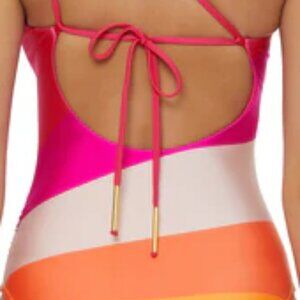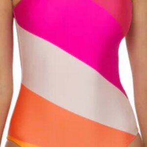 NWT - Trina Turk Womens Luxurious One-shoulder, One-Piece Swimsuit. Colorburst, (Pinks/Oranges/Blush) Size 14