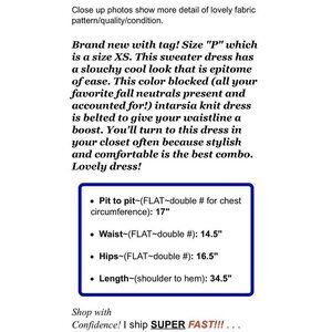 Brand new with tag! Size "P" which is a size XS. This sweater dress has a slouchy cool look that is epitome of ease. This color blocked (all your favorite fall neutrals present and accounted for!) intarsia knit dress is belted to give your waistline a boost. You'll turn to this dress in your closet often because stylish and comfortable is the best combo. Lovely dress!