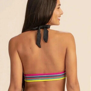 A textured zebra pattern adorns this halter top adding unique dimension to your swim wardrobe, while its contrasting rainbow trim creates a colorfully bold appeal.