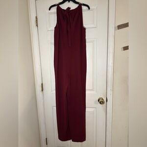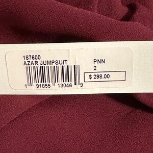 Stunning Trina Turk NWT burgundy color Azar jumpsuit. She is a size 2 measuring 19 1/2” P2P, 19” waist and 32 1/2” inseam. Material is 100% Polyester. She is a designer piece and is stunning!!