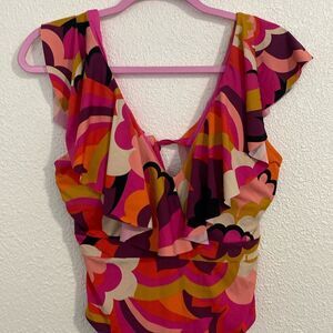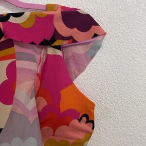 NWT- Trina Turk-pink and orange wave print ruffle neck one piece swimsuit-Size 8
