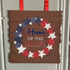 The third sign has a rustic faux brown wooden background with a beautiful red white and blue star wreath centered with the glittered sentiments HOME OF THE BRAVE in the center of the wreath.